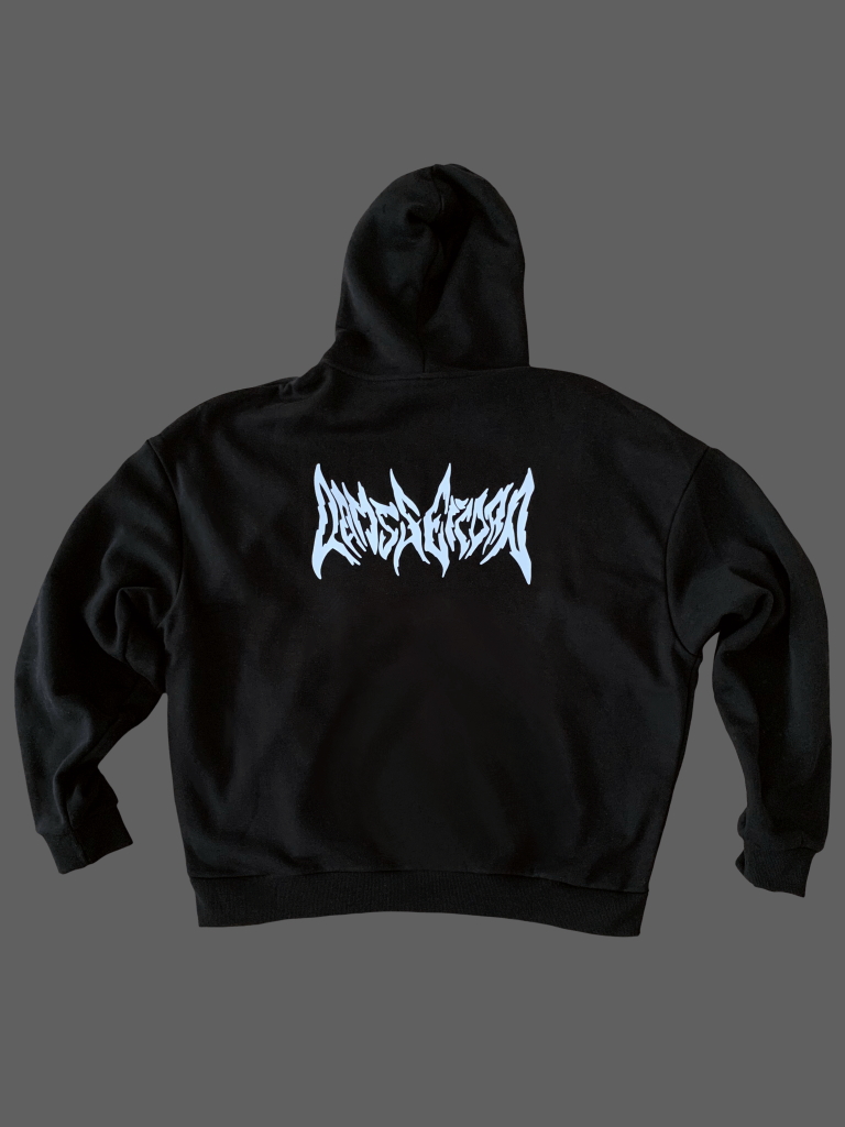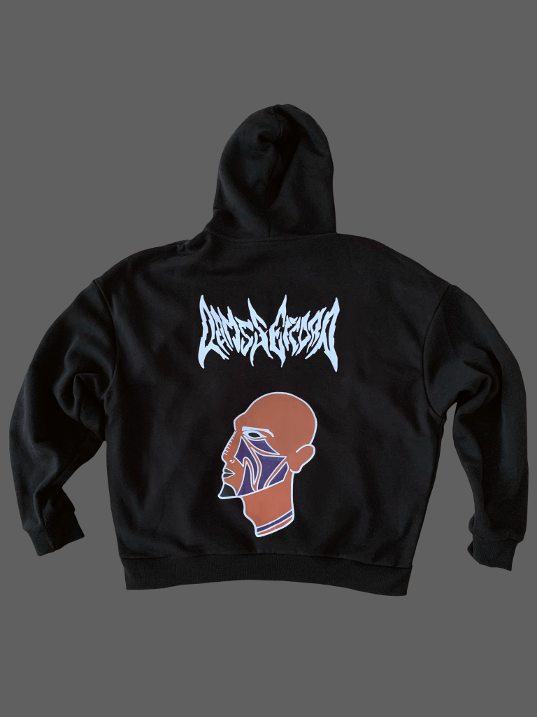 Cette pièce a été conçue tel un artefact. Le modèle est surplombé d’une écriture rock au dos et du même logo en format réduit à l’avant du hoodie pour un effet minimaliste.