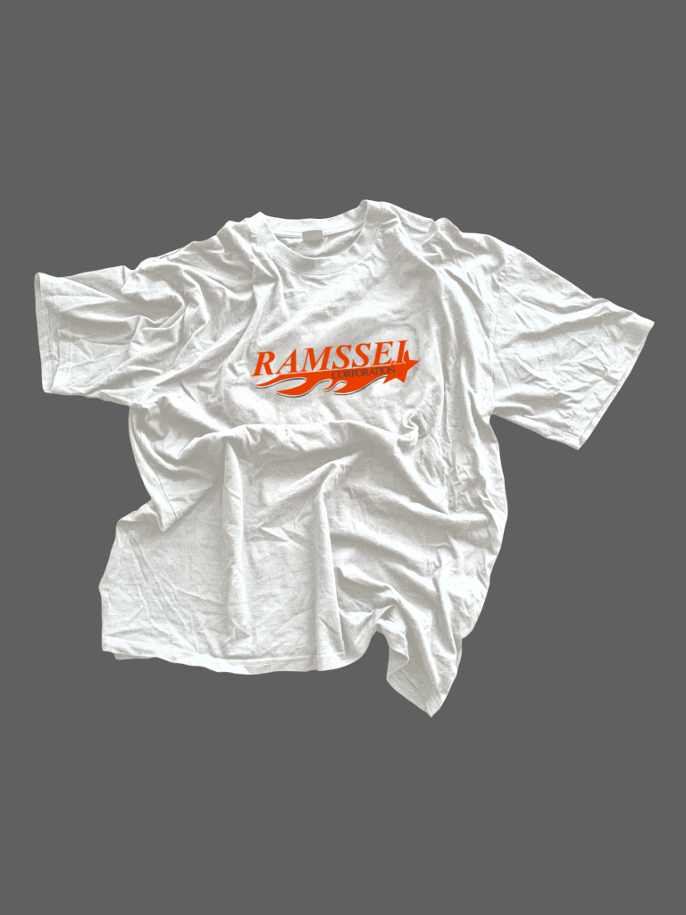 T-shirt noir avec gros logo orange « RAMSSEI » sur le devant du t-shirt et gros logo sur le dos.