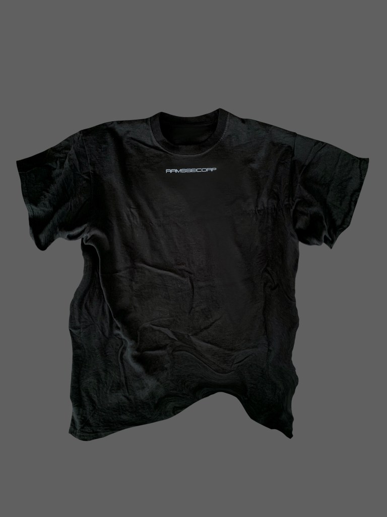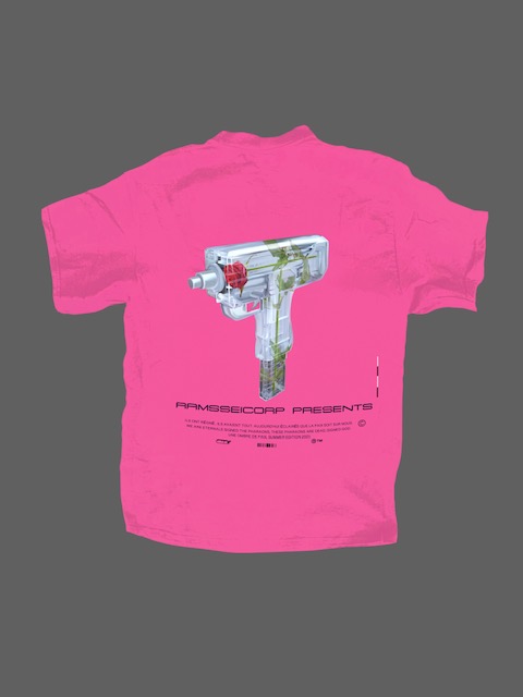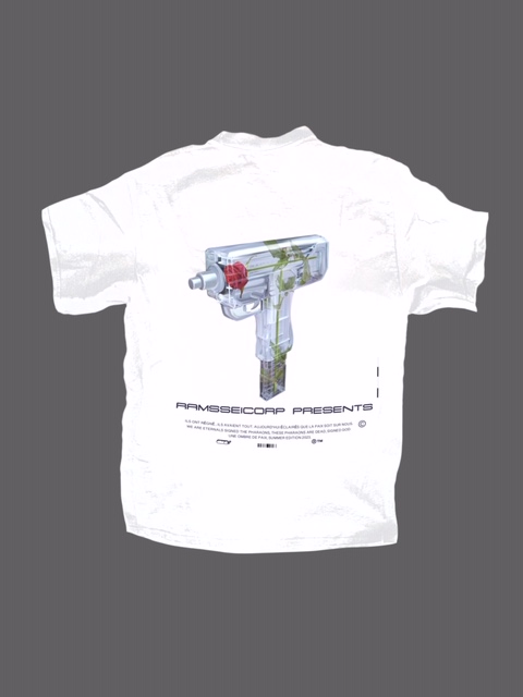 T-shirt noir avec uzi à rose dans le dos « Une ombre de paix ». Collection été 2023