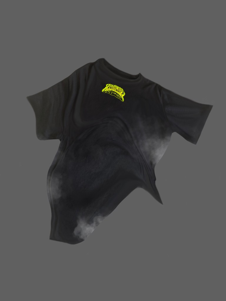 T-shirt avec logo Big Ramsseicorp. Modèle noir avec l’écriture jaune sorti pour l’été 2022 sous un temps caniculaire.