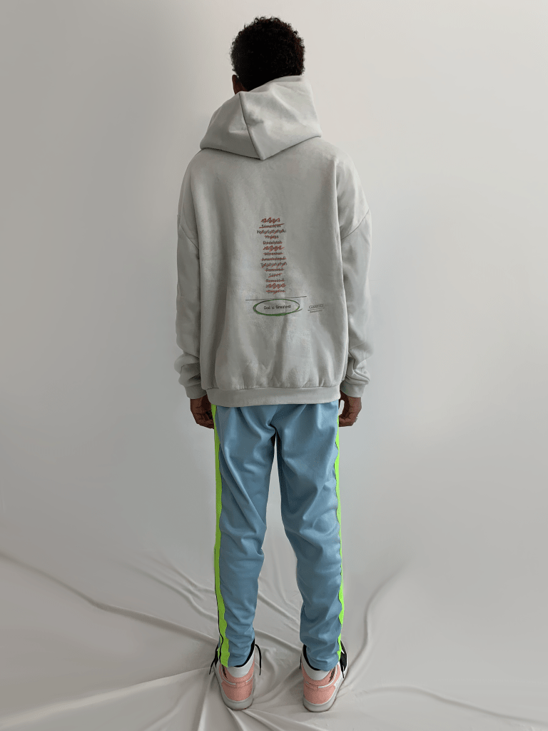 Le hoodie retrace plusieurs noms de pharaons barrés en rouge, à la suite se trouve l’iconique « God is Greatest » de Ramsseicorp, entouré en vert, indiquant le bon résultat d’un calcul simple. Devant le logo classique Ramsseicorp est posé.