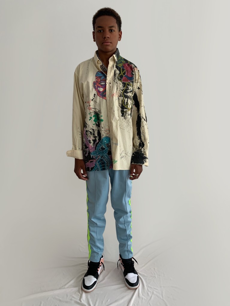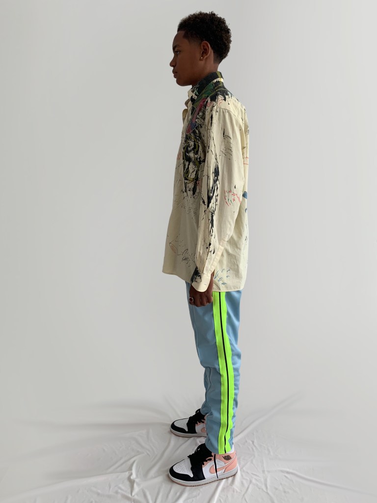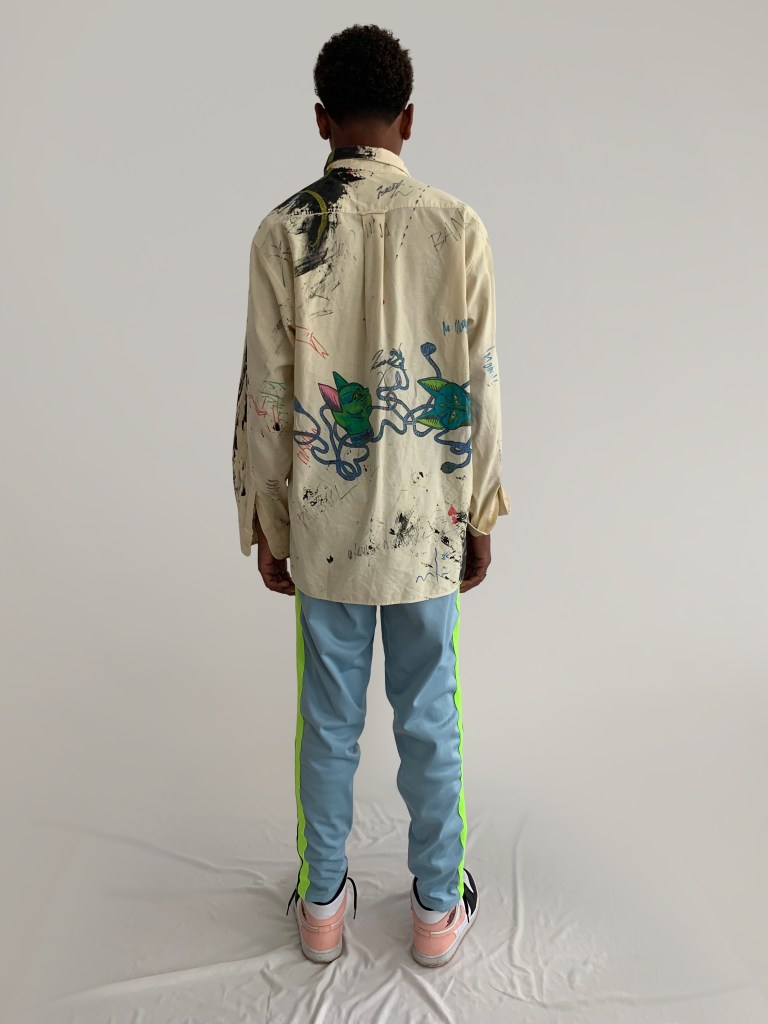 Chemise jaune avec logos et traces de peinture. Conçue après un voyage à Dubaï , la chemise flotte entre immensité du désert et modernité artistique de cette ville.