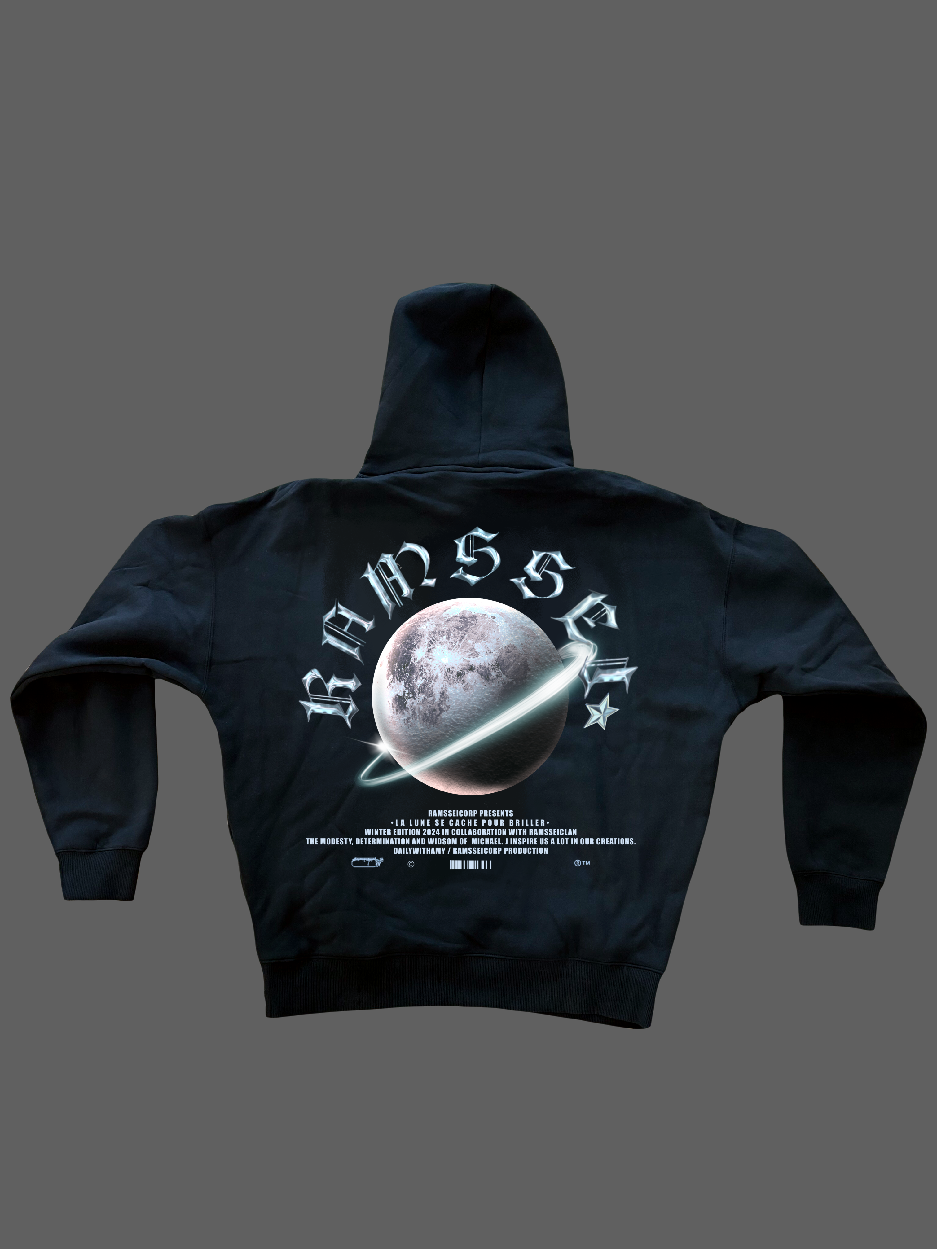 Ce hoodie est un hommage au roi de la pop. La modestie et la determination de cet artiste hors du commun ont tant inspirées la marque depuis sa création. Il était donc nécessaire que 15 ans après la disparition de cette légende, Ramssei dédie une collection entière à cette lune qui s’est toujours cachée pour briller. Cette collection a été faite avec un esprit de paix et un message de monde meilleur, un message que M.J s’est toujours efforcé de faire passer à travers son art.