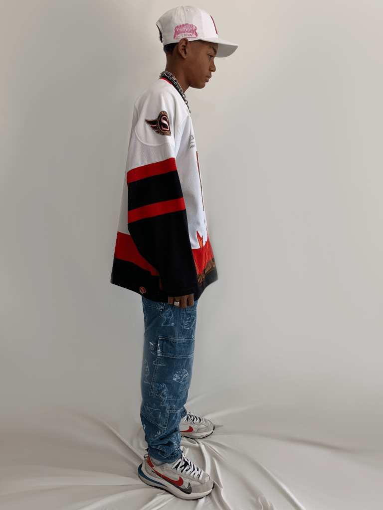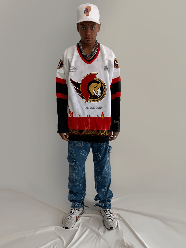 Maillot avec patch médaillon romain. Modèle blanc avec différents logos Ramsseicorp et flammes rouge et jaune.