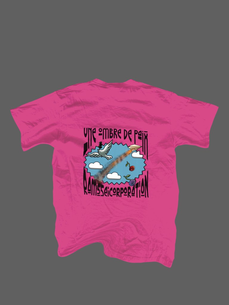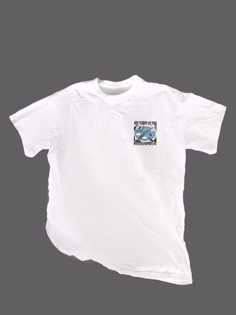 T-shirt blanc avec gros logo bleu dans le dos « Une ombre de paix ». Collection été 2023